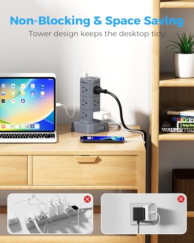 Power Strips with Surge Protection, Flat Plug Power Strip with 12 Outlets 4 USB Ports, Surge Protector Tower 1875W/15A 1080J, Extension Cord with Multiple Outlets, Office Supplies, Dorm Essentials